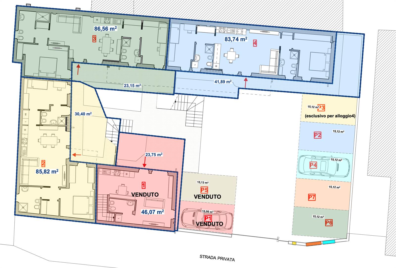 Tutte le unità sono trilocali con doppi servizi, dotate di: